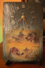 гжель-авторская работа под названием"Пора на охоту"-2006 год, куплена при магазине исторического музея в москве из-за характерной передачи позы потягивающейся борзой, металл-привезена друзьями в подарок из Барселоны(была просьба привезти Гальго) но привезли с блошиного рынка явно оформление светильника., Бутыль-подарок президента Швейцарского клуба РПБ, часы-подарок подарок президента Французского клуба РПБ Картинка
