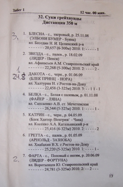 Начался новый сезон 2010 г. на Ростовском ипподроме. Первые 5 забегов прошли 10 мая. Лучшее время дня показал двухлетний Абсолют ( Лидер – Пепси), вл. Терещенко С.. В трех из пяти забегов участвовали молодые собаки возраста от 1 года. Лучшим среди них стал годовалый Мустанг Драйв (Элбони Бумер-Леди Бренда), вл. Алейников С., показавший 2-е время дня! Остальные забеги среди молодых собак выиграли Хани Хоуп (Блек Хантер – Элбони Бентли), вл. Алейников С. и ее однопометник Хитман Хоуп (вл. Бондаренко А.) Забег 1. Кобели и суки грейхаунды Дистанция 300 метров 1 МАММА МИА - с., черн. (ШОКИНГ Ю - Виктори-Бест) вл. Яцкин А. Сальский р-н 19.692 2 НИКАН 20.014 3 ИНФАНТ 20.055 4 МАКС 20.097 5 ЖОРДЕН 20.130 6 ЕВРО 20.699 . Забег 2. Кобели и суки грейхаунды Дистанция 300 метров 1 АБСОЛЮТ - к., палев. (ЛИДЕР - Пепси) вл. Терещенко С.г.Арзгир, Ставропольский кр. 18.822 2 ШКВАЛ 19.568 3 ШАРАДА 20.045 4 ДЕНИСА 20.055 5 КАДРИЛЬ 20.544 6 БЛЕСНА 20.657 Забег 3. Суки грейхаунды Дистанция 300 метров 1 ХАНИ ХОУП - с., черн. (Блек Хантер /Венгрия/ - ЭЛБОНИ БЕНТЛИ ) вл. Алейников С.Н. Зерноградский р-н 20.335 2 ДАМОЧКА 20.599 3 СЛАВА 21.149 4 ЛИКВИДАЦИЯ 21.631 5 ЗВЕЗДА 22.268 6 ЖАННА 23.603 Забег 4 Кобели грейхаунды Дистанция 300 метров 1 МУСТАНГ ДРАЙВ - к., тигровый (ЭЛБОНИ БУМЕР - Леди Бренда) вл. Алейников С.Н. Зерноградский р-н 19.556 2 ТРИГЕР ЭКШН 19.801 3 ДИ ДЖЕЙ 19.878 4 ЦЕНТУРИ 20.263 5 СИМБА 20.571 ВАНЬКА 1 снят Забег 5. Кобели и суки грейхаунды Дистанция 300 метров 1 ХИТМАН ХОУП - к., тигровый (Блек Хантер /Венгрия/ - ЭЛБОНИ БЕНТЛИ ) вл. Бондаренко А. А. Целинский р-н 20.300 2 ТАЙРА 20.437 3 МОТВЕЙ 20.807 4 БЕСТА 20.849 5 САЙГОН 20.947 6 ДАКОТА 20.996 |