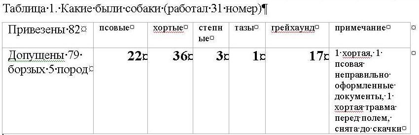 Были привезены и заявлены на состязания 82 борзые 5 пород. Не допущены 2 собаки (псовая и хортая) из-за неправильно оформленных документов, снят до пуска 1 грейхаунд (небольшая травма). Вышли в поле 79 борзых 6 команд (51 собаки )и личники (28 собак). Перевидели зверя, скакали не менее 1 раза и расценены:77 борзых 5 пород, включая псовые 21, хортые 35, степные 3, тазы 1, грейхаунд 17 (еще 1 без зверя, 1 снята в поле из-за травмы). Получили индивидуальные дипломы 2 и 3 степеней:Всего 20 (26%), Псовые 5 (24%), Хортые 8 (23%), Степные 1, Тазы 1, Грейхаунд 5 (29%) (проценты от числа собак каждой породы допущенных до состязаний) Получили инд. дипломы с поимкой: Всего 10 (13%), из них хортые 9 (25%), тазы 1, псовые 0, степные 0, грейхаунды 0 12 номеров получили право перескачки: а) заяц понорился (6 номеров, 14 собак,но не все его использовали) б) после подпусков (3 номера, 7 собак) в) при невозможности следовать за скачкой (1 номер, 3 собаки) г) по специальному распоряжению главного эксперта (2 номера, 6 собак) |