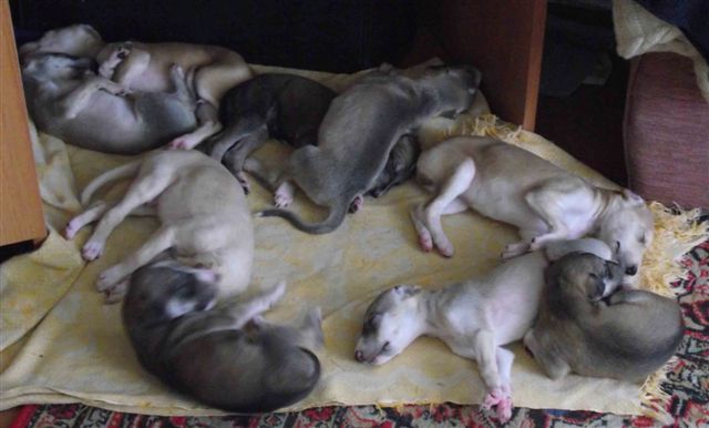 А мы тоже растем...Позавчера у Лады родились щенки,пять девчонок,три из них окрасом копия мамка и четыре пацана.Отец-Вальтер(отл.,Д2 в паре и "трешки",вроде брат Мондео),у мамаши Д2,2Д3,все с поимкой в одиночку,на первых в своей жизни испытаниях "кинула" трех подпущенных греев при большом скоплении поклонников этой породы и так плотно вела заиса,что тот убился головой об дерево насмерть-без расценки и перескачки...От пред.вязки её дочь Багира в Калмыкии взяла "трешку" с резв. 20 баллов,сбила зайца с ног,но не удержала-щенку было 9 мес.,опыта мало(эт которая на 1-ой странице).Ну и в ринге на краевых-Лада первой ходит,еще друзья ее зовут-Бультерьериха... И как положено у сельских охотников,счастливая мамаша расположилась в хозяйской спальне (сам хозяин обретается пока в комнате для гостей...) |