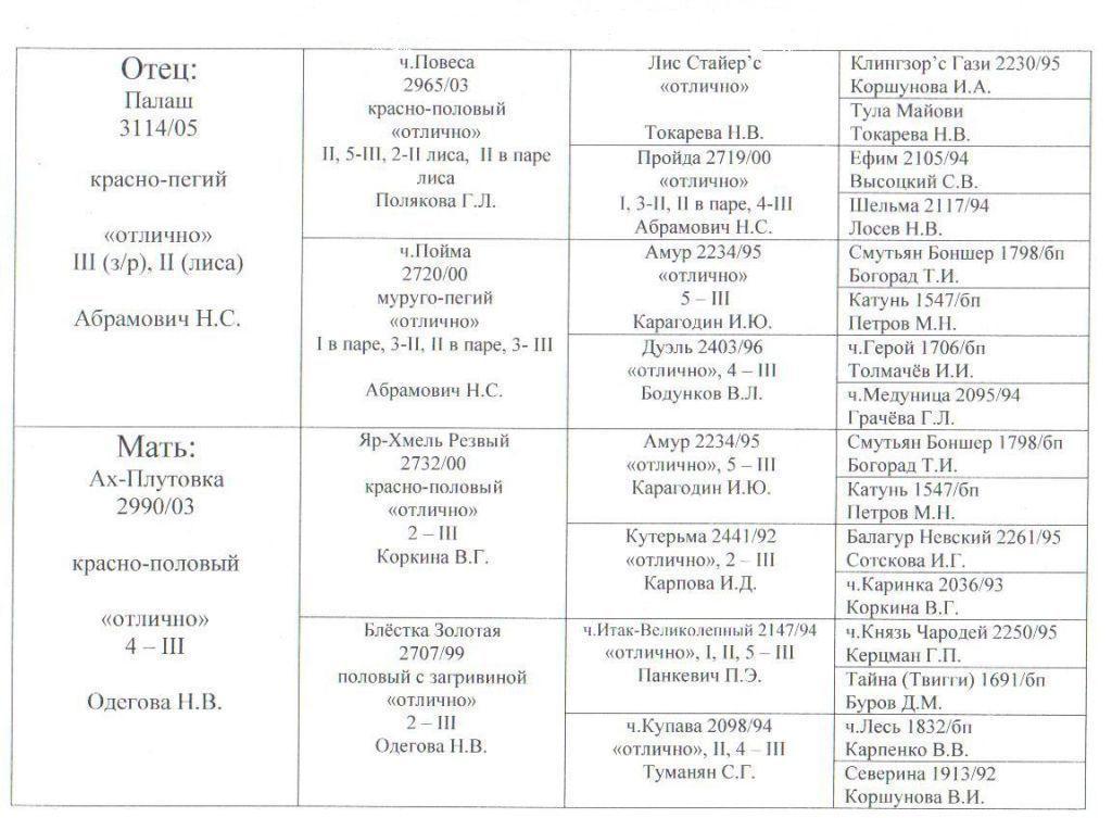 Данная вязка осуществлена с инбридингом 3:3 на Амура 2234/95 Карагодина И.Ю.