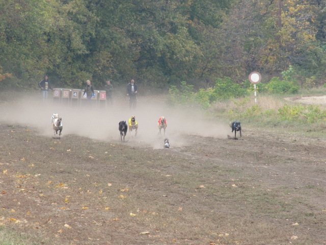 - пуски грейхаундов из боксов в попонах, первые три финишировавшие собаки выходят в следующий круг, минимальное количество грейхаундов в одном забеге четыре;