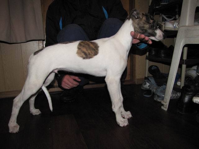 Растянутый, носится по двору "стелящися", голова "точеная", зубки отличные. В комплекте два "бубенчика" между ног. Костяк крепкий, постав лап широкий, грудная клетка объемная.