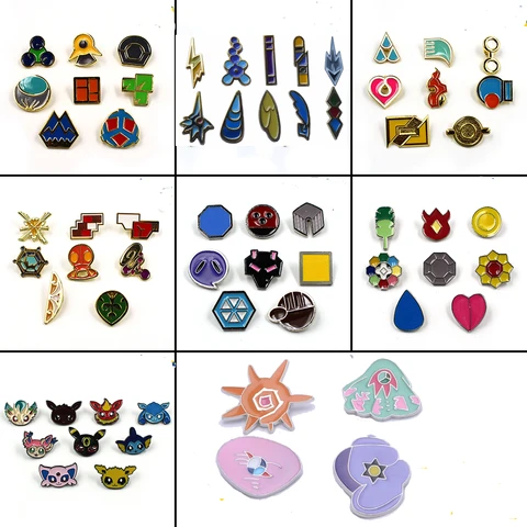 € 52,45€ 65,56-20% 10 комплектов карманный монстр Покемон Канто 8 металлическая Лига значок для тренажерного зала пин поколение косплей реквизит коллекционный набор 80 * значки + 10 * коробки