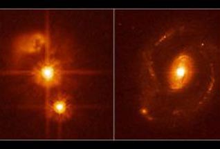 Галактики М65 (NGC 3623) и М66 (NGC 3627), в созвездии Льва На нижнем изображении можно увидеть скопление сверхдалеких квазаров и галактик, расположенное на небе в созвездии Льва. Возможно, это скопление представляет собой самую большую космическую структуру, когда-либо наблюдавшуюся человеком. Яркие красноватые объекты на снимке — звезды переднего плана; далекие галактики видны как еле заметные размытые пятнышки. |