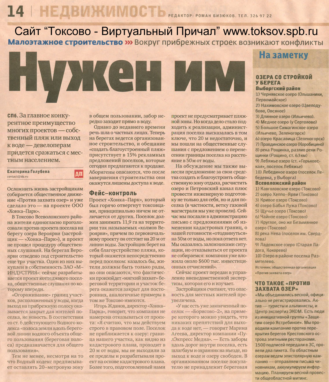 3 декабря 2007 года, газета "Деловой Петербург", статья "Нужен им берег озерный" (фрагмент), автор Екатерина Голубева: