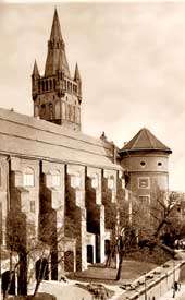 ![]() Внутренний двор королевского замка (замок утрачен) Калининград. Начало городу положили крестоносцы. Покорив пруссов в 13 веке, в 1255 году заложили замок Кенигсберг. Кстати, прусские земли - последнее, что им удалось захватить. Изначально и до 1724 года на месте Кенигсберга было три города: Кнайпхоф, Альштадт и Лёбенихт. Преобразование в единый город носил формальный характер, поскольку границы городов буквально соприкасались. С 1701 года здесь короновались прусские короли. Еще бы, ведь Кёниг в переводе с исконного языка этой земли - "король". В ходе семилетней войны в 1758 году Кенигсберг был сдан и на четыре года Восточная Пруссия стала российской губернией. Но взошедший на русский престол в 1762 году Петр III, поклонник военного гения Фридриха II, вернул эти земли своему кумиру. В конце 19 века стараниями Бисмарка германские княжества, в том числе и Пруссия, объединились. Кенигсберг строился на реке Прегель, которая на востоке распадается на два рукава и соединяется в центре города, образуя два острова. Остров центральный, бывший Кнайпхоф - место вне времени, территория возрожденного Кафедрального собора и последнего приюта Великого Канта. http://silen.ru/photoalbum_ru/kaliningrad_area/kaliningrad/index_01.php Фото (25 МБ) замка Кенингсберга http://commons.wikimedia.org/wiki/Image:K%C3%B6nigsberg_Castle.jpg Про Кафедральный собор в Кёнигсберге см. тему Кафедральный собор в Кенигсберге Старинные фото про Кёнигсберг см. в постинге от 14-02-2008 в теме Старинные фото архитектурных памятников (кроме Латвии) |